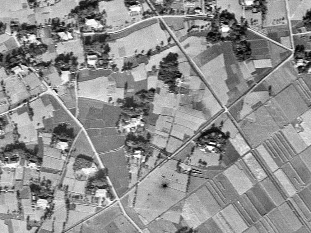 写真1 昭和22年に撮影された航空写真の一つ。二ノ丸や本丸を取り囲む曲輪や堀の様子がわかる。
